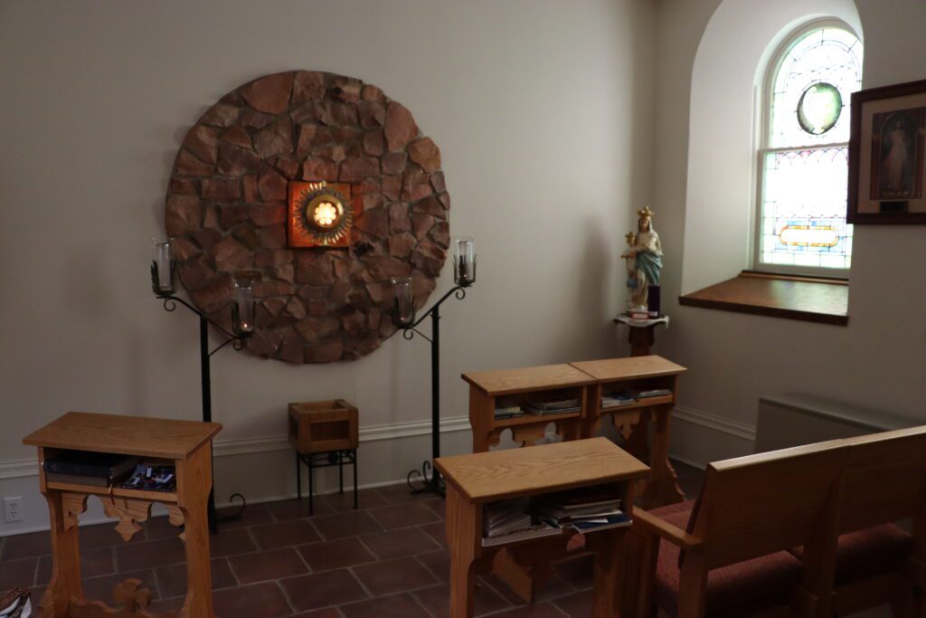 La adoración se lleva a cabo en la Capilla de la Adoración ( capilla a la derecha del altar de la iglesia ). Cualquiera es bienvenido a pasar en cualquier momento.